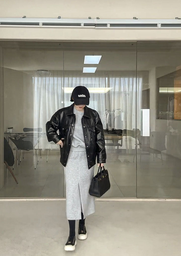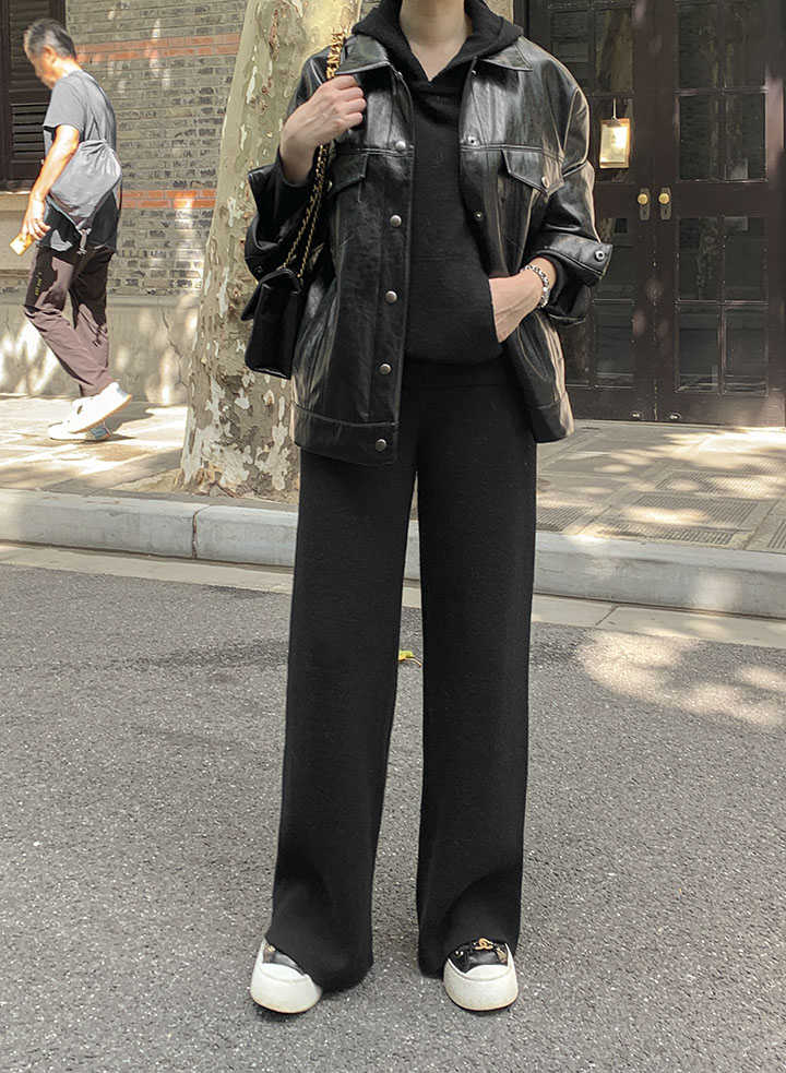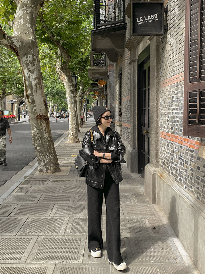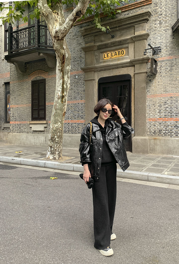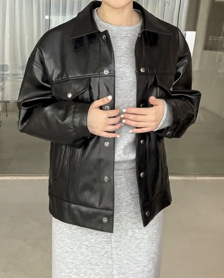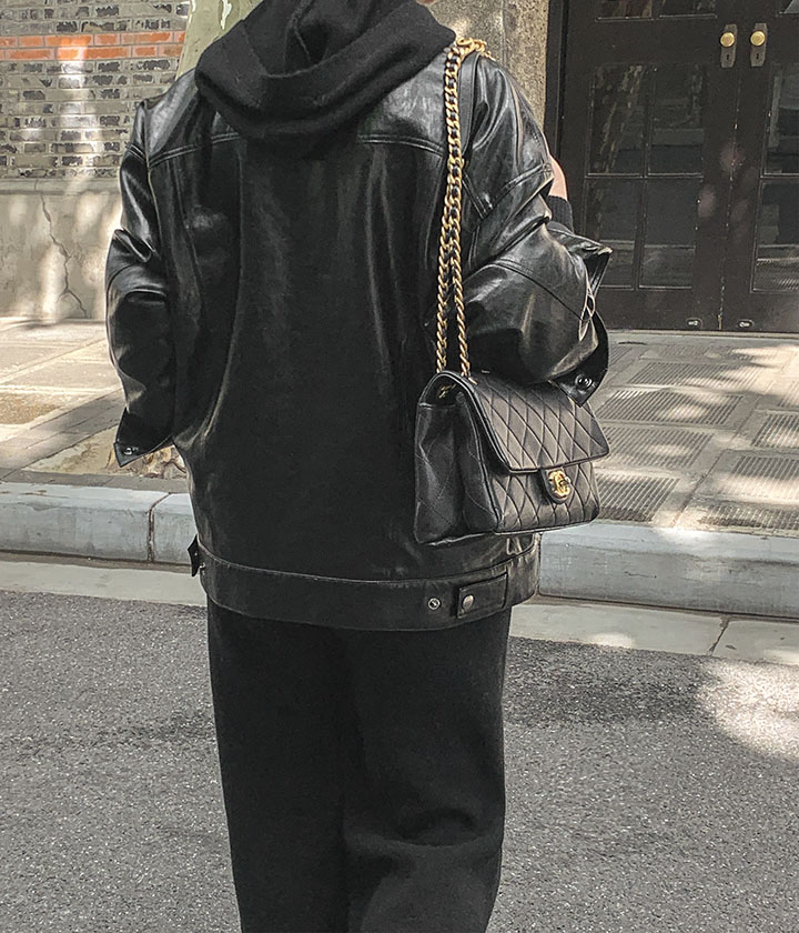 A black leather jacket that blends naturally into any look. It's a great brand quality that's perfect for wearing every season.