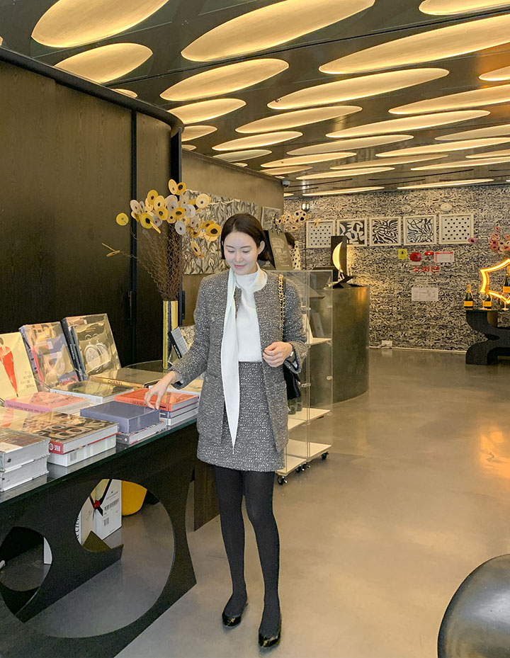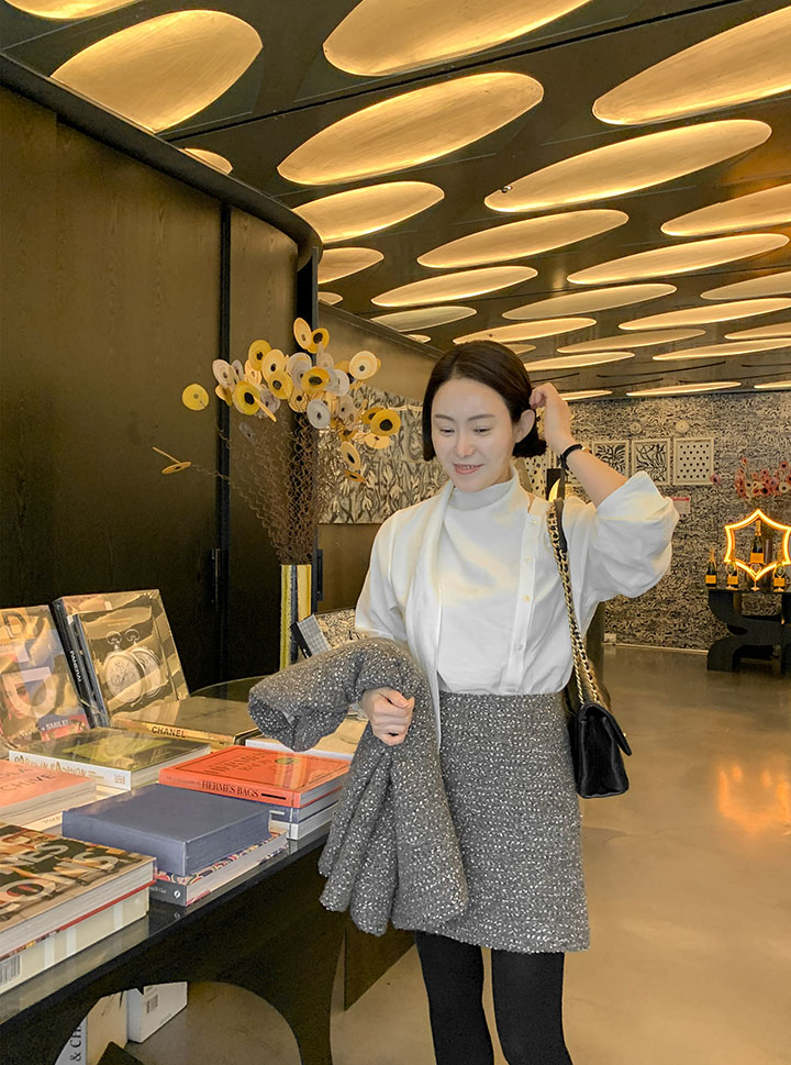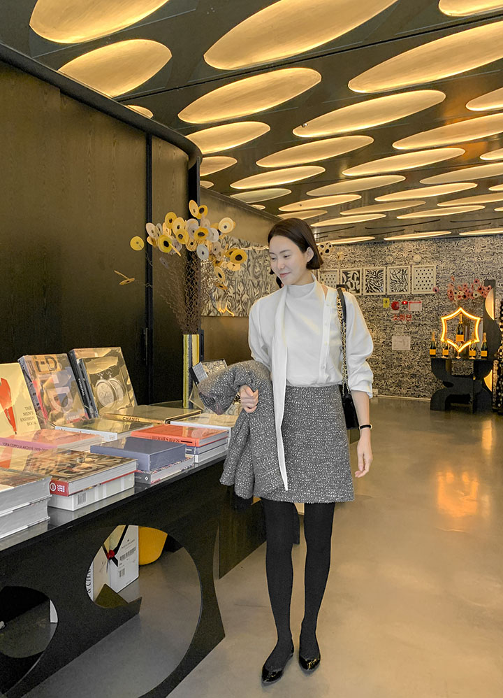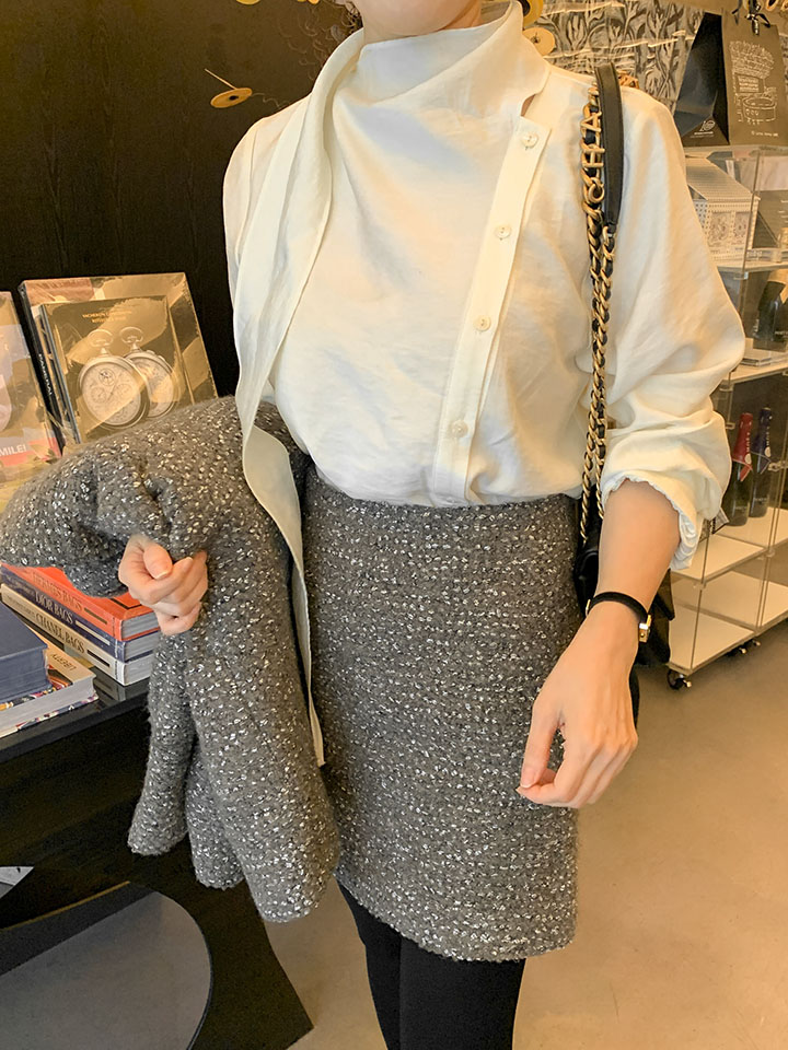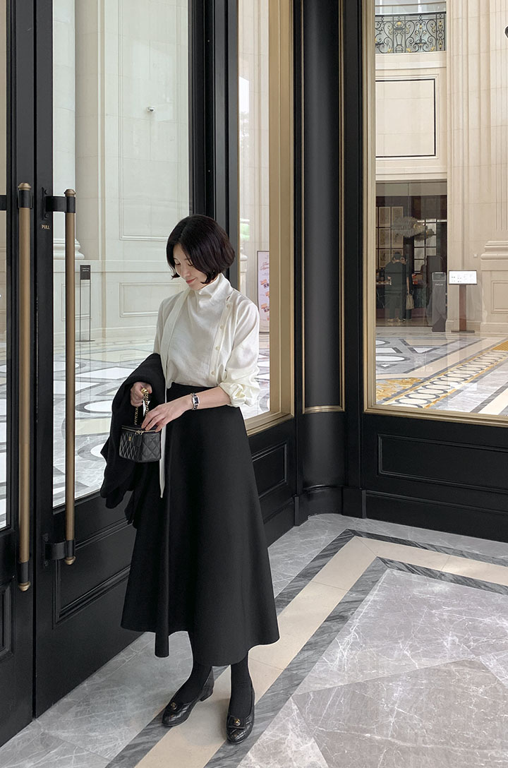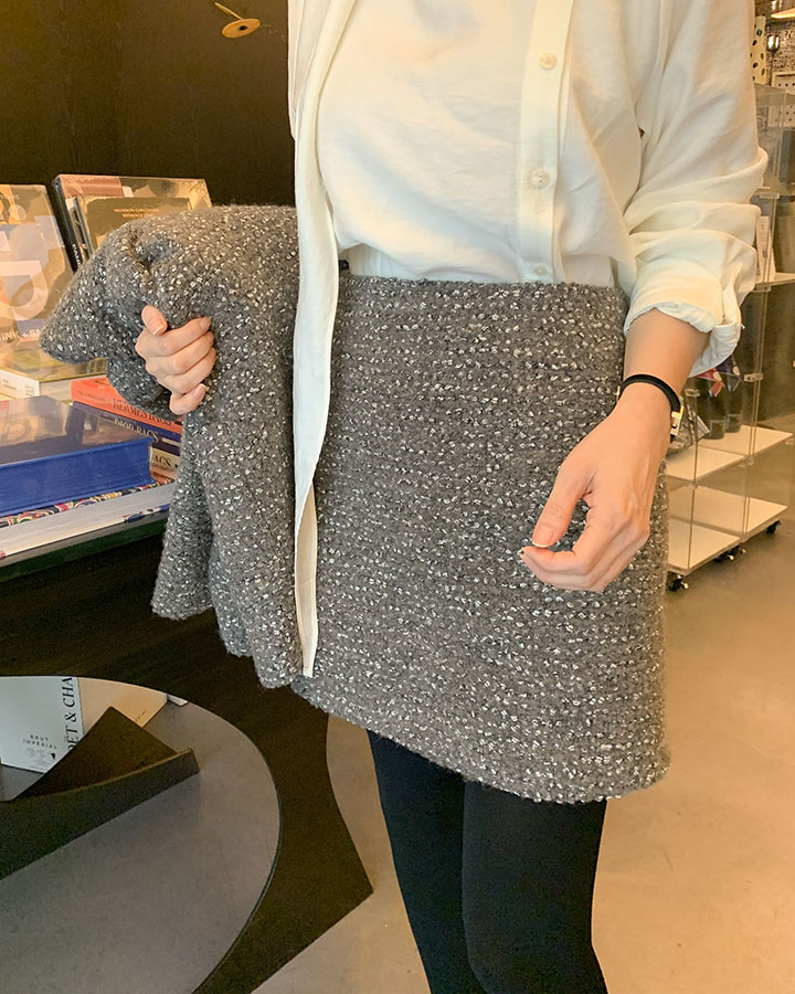 A warm and luxurious semi-A-line tweed skirt made with 50% wool, made in-house. A pretty silhouette.