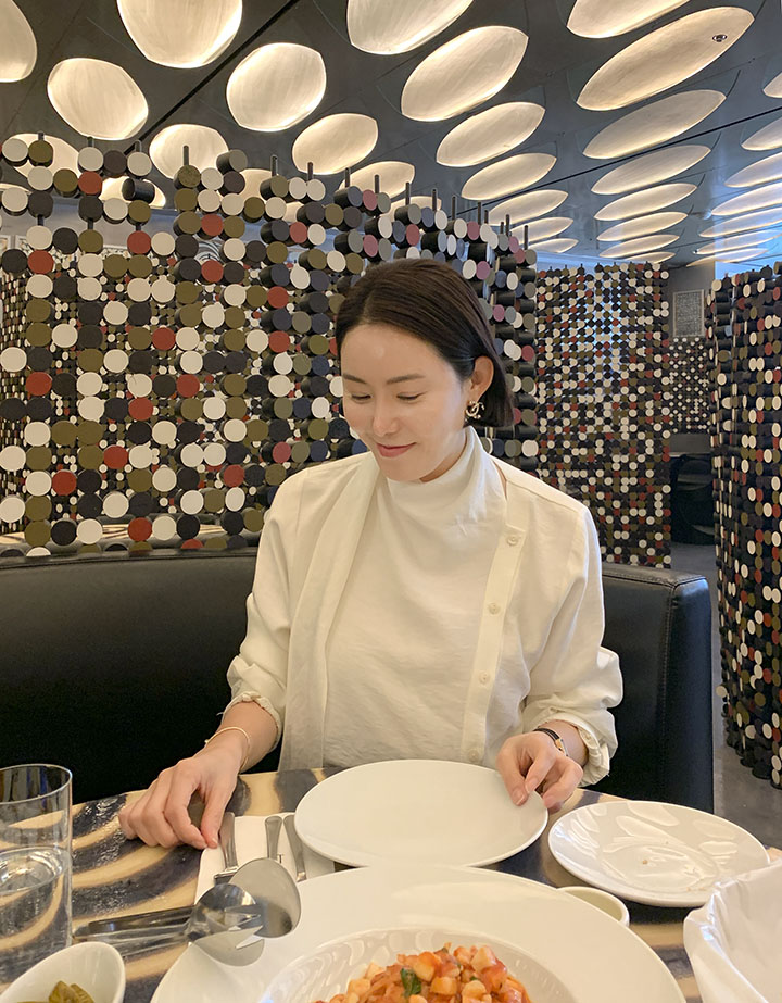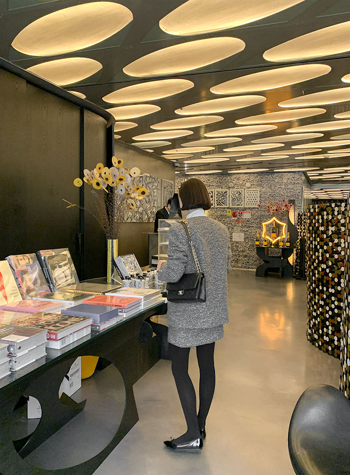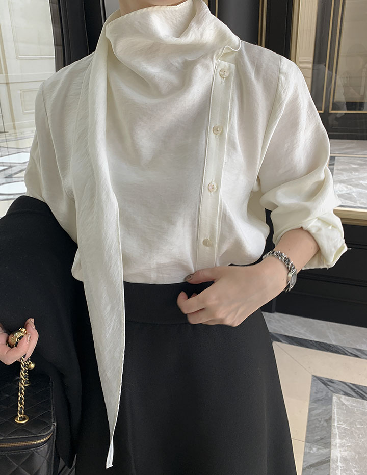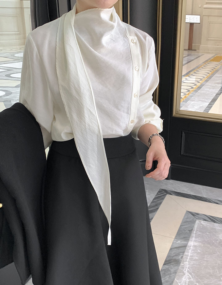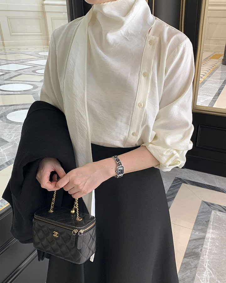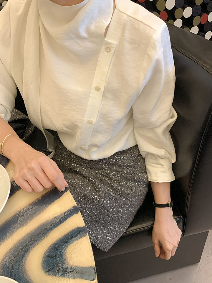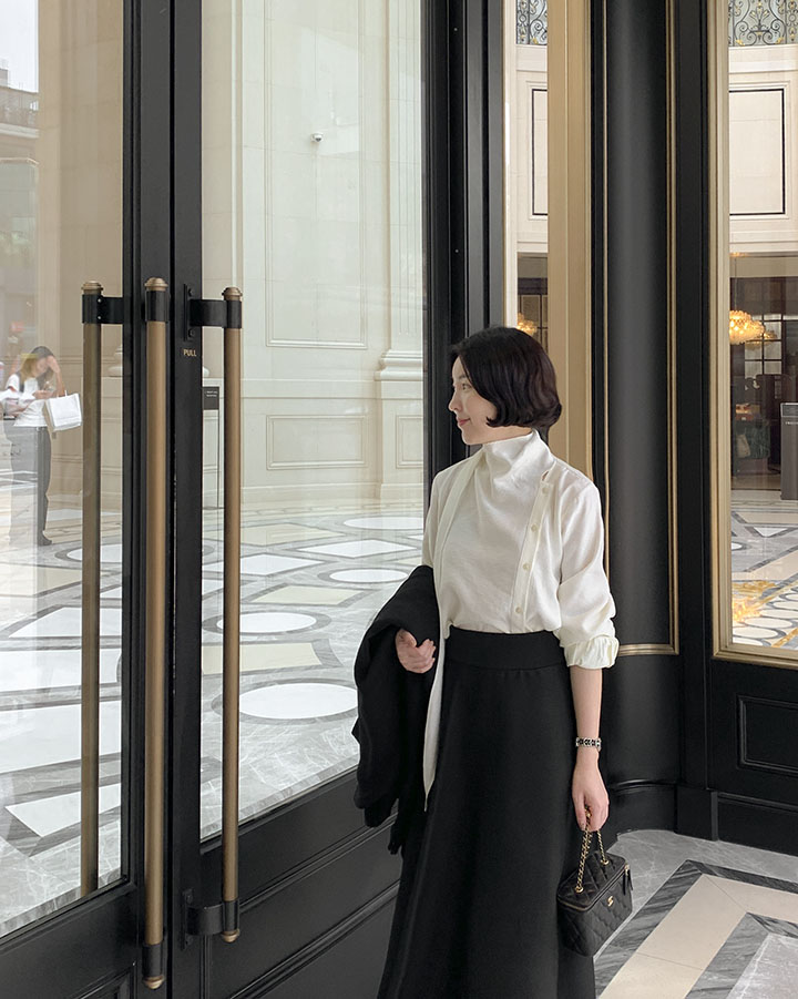A warm and luxurious semi-A-line tweed skirt made with 50% wool, made in-house. A pretty silhouette.