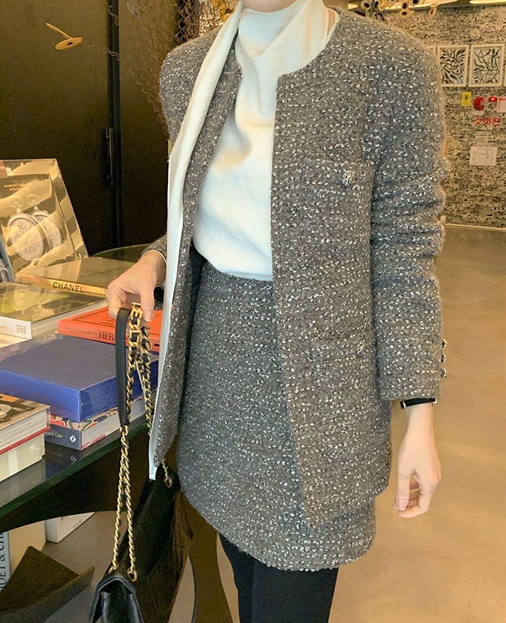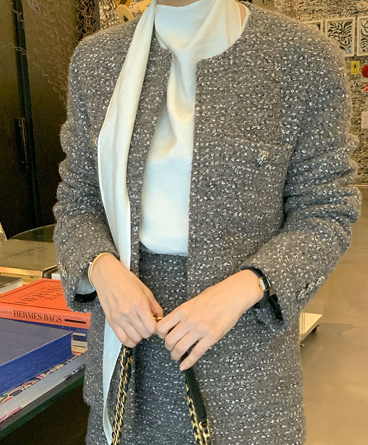 [Pre-order takes 2 weeks] Made in-house, warm and luxurious with 50% wool, this floor-length Chic No-collar Tweed Jacket is made with 50% wool and is lined with pearls.